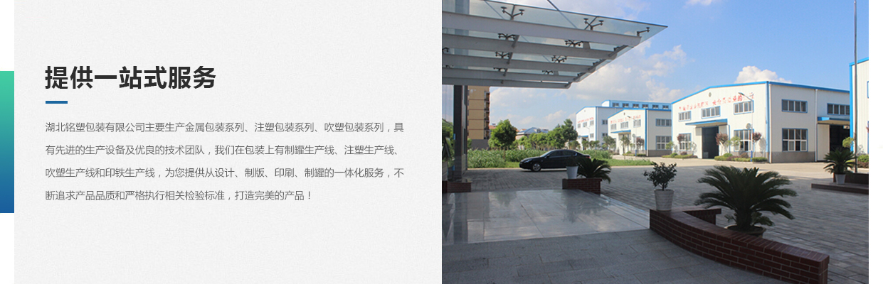 湖北銘塑包裝有限公司一家集研發(fā)、生產、銷售于一體的較優(yōu)秀民營企業(yè),技術力量雄厚,產品質量可靠。位于交通暢順,百業(yè)興旺、經濟富裕、政策開放的孝感開發(fā)區(qū)域。我們企業(yè)的營銷戰(zhàn)略是以建筑為土壤,以產品為種子,以質量為肥料,讓綠色鋪滿全球。憑借多年來的行業(yè)經驗,公司不斷進行創(chuàng)新和研發(fā),為市場提供更廣泛的產品應用領域和更好環(huán)保節(jié)能產品,為國家能源環(huán)保戰(zhàn)略和可持續(xù)發(fā)展戰(zhàn)略作出應有的貢獻。     湖北銘塑包裝有限公司主要生產金屬包裝系列、注塑包裝系列、吹塑包裝系列,具有先進的生產設備及優(yōu)良的技術團隊,我們在包裝上有制罐生產線、注塑生產線、吹塑生產線和印鐵生產線,為您提供從設計、制版、印刷、制罐的一體化服務,不斷追求產品品質和嚴格執(zhí)行相關檢驗標準,打造更好的產品!